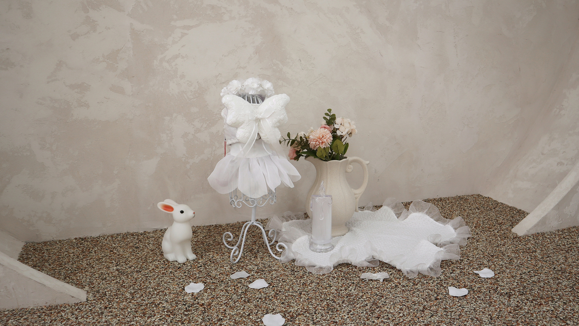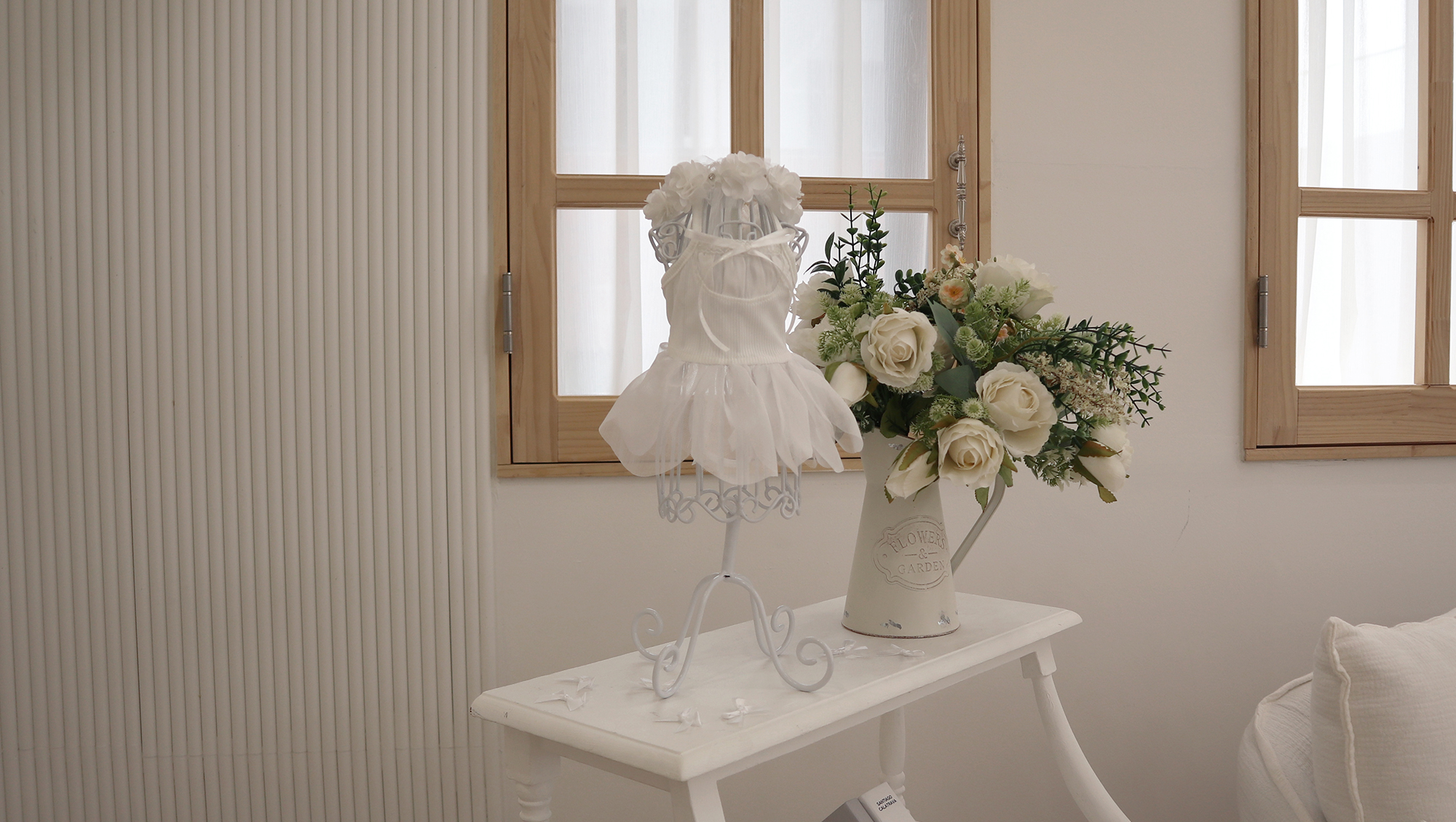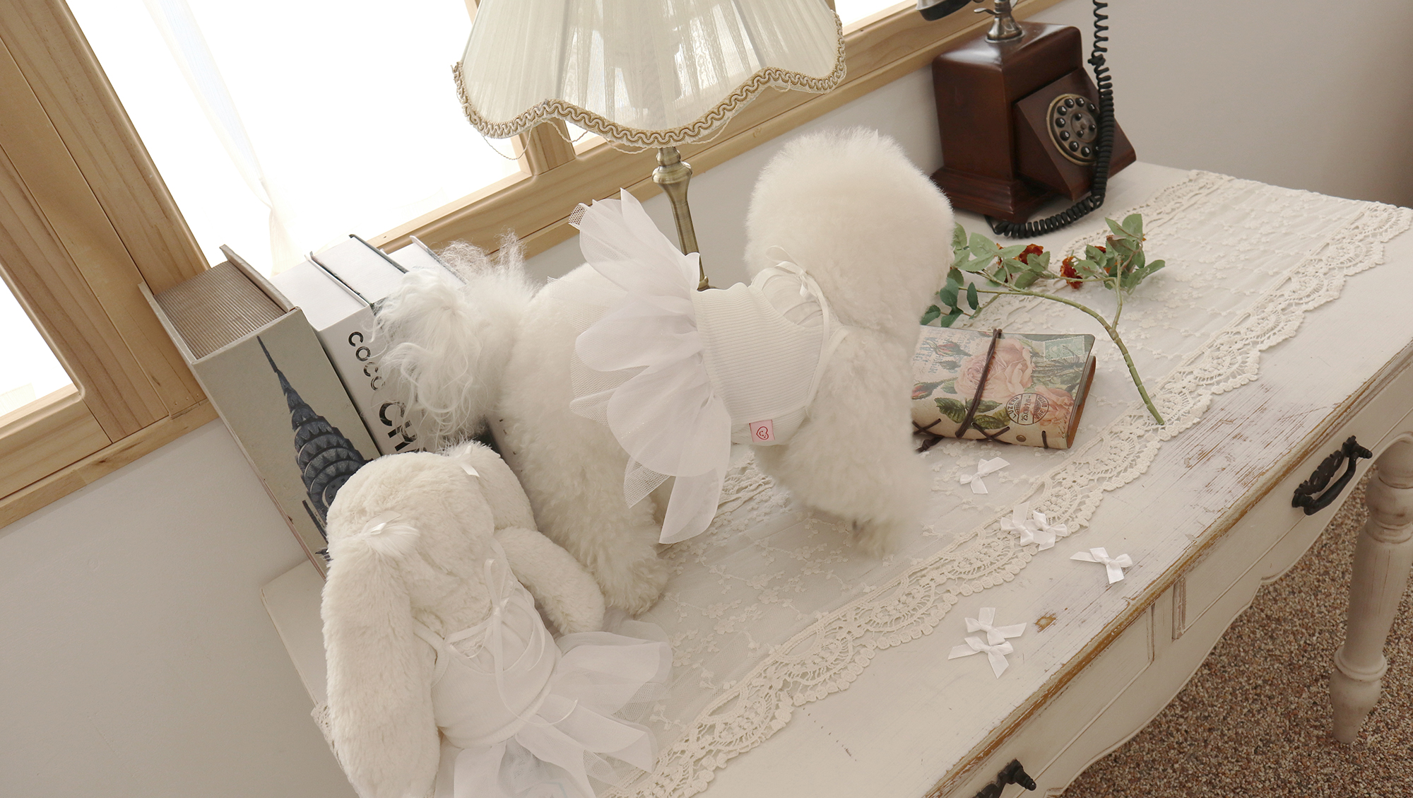 기본적인 골지 튜튜 드레스의 단조로움을 탈피하고자 빈티지한 주름이 잡힌 원단과 리본 레이스로 포인트를 줬어요.