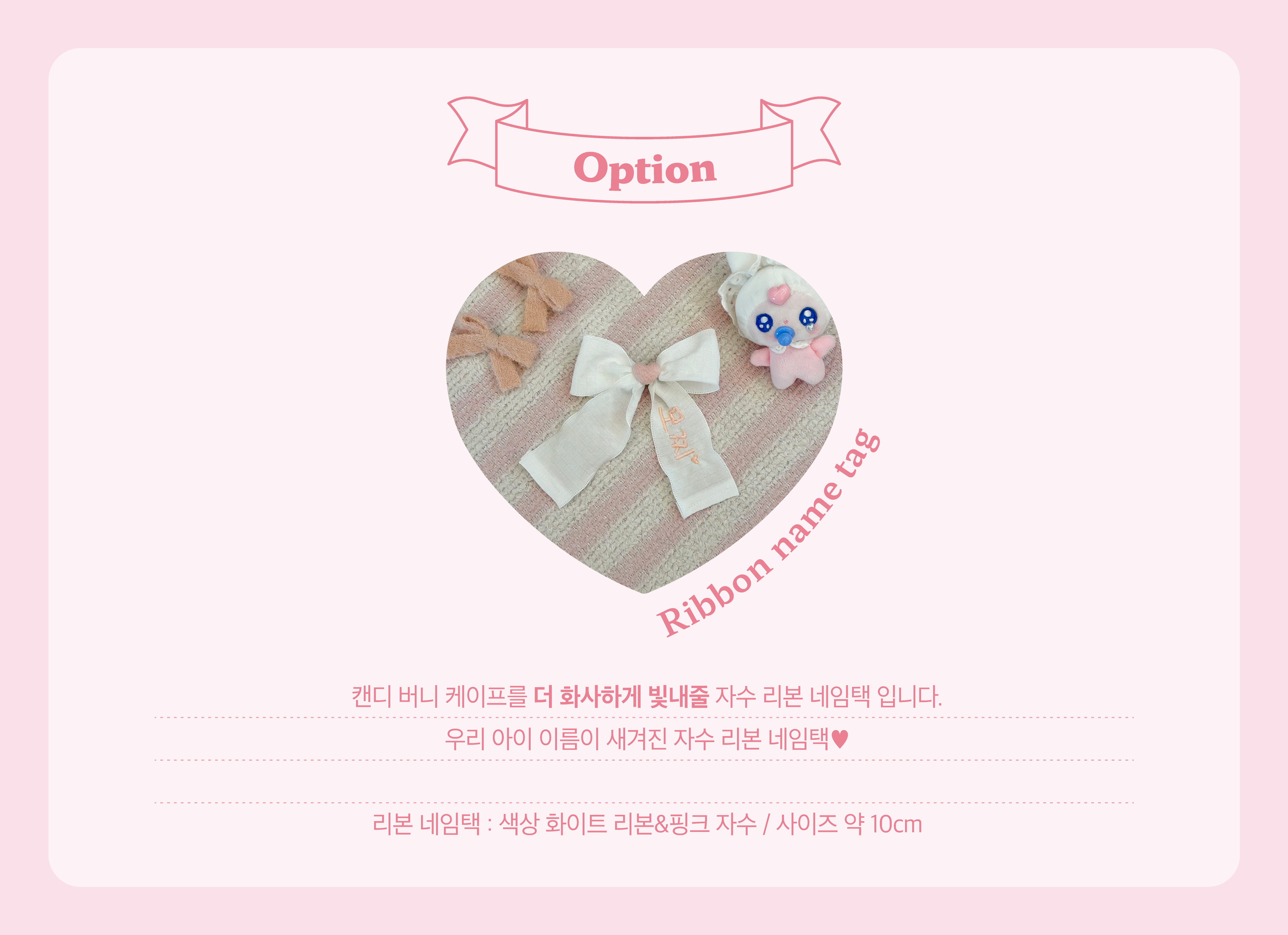 캔디 버니 케이프를 더 화사하게 빛내줄 자수 리본 네임택 입니다.